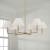 The decadence is in the details. The Gilda Large Chandelier brings the glamour with interchangeable tortoise shell or clear acrylic bobeches. The Aged Brass finish adds a warm tone, while the tapered White fabric stay-straight shades and squared arms create a crisp, classic aesthetic.