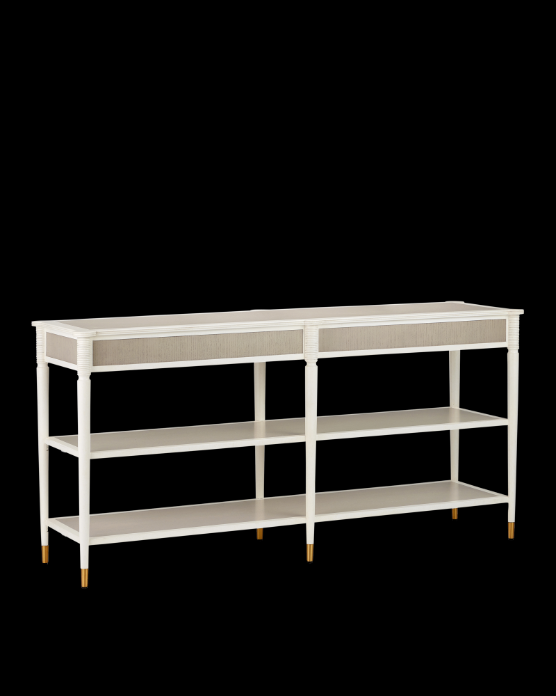 Made of mahogany and oak in a mix of off-white and fog finishes, the Aster Console Table was inspired by an antique from the Winterthur Museum. The gray and white console table has two shelves and is fitted with polished brass ferrules. This piece is in the Winterthur Collection.