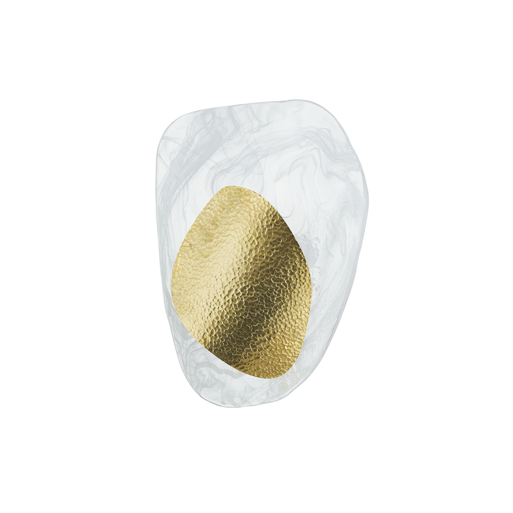 Dynamic design lines and layered materials combine in the eye-catching composition of Bilbao. This artful sconce pairs delicate cast Piastra glass with a hammered Vintage Brass abstract form, creating a luxurious contrast. As it gently curves away from the wall, Bilbao breathes life into a space with its vaguely botanical beauty.
