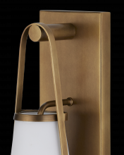 The Brompton Brass Bath Wall Sconce dangles its shade like it is balancing a canister filled with illumination. Designed with a slim, rectangular wall-plate made of wrought iron in an antique brass finish, the knob from which the shade hangs and the handle that cradles it are also in metal in the same finish. The opacity of the beautifully shaped shade on the gold wall sconce creates a luminous glow.