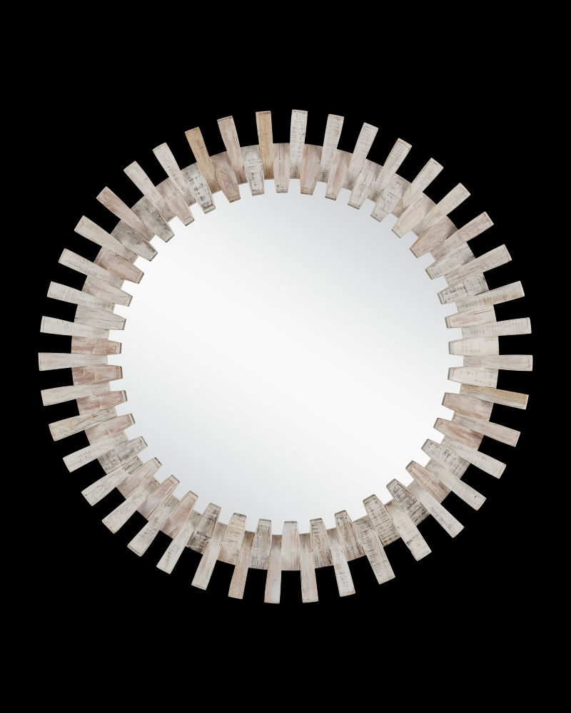 The Diza Round Whitewash Mirror has a profile that is just as interesting from the side as it is from the front. This is because the wood pieces, which taper and are fitted in by hand, splay outward on both the exterior and the interior of the white mirror. The depth this creates will make the decorative mirror a commanding element in a space. Both the woodgrain that shows through in spots and the shape are textural details.
