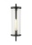 The Eastham one light outdoor wall fixture in textured black by Chapman & Myers is designed with an upright square metal crossbar which extends beyond the top and bottom of each light to both support and define each light. The crossbars intersect two stepped top & bottom metal rims and capture the cylindrical glass shade. Each is illuminated by a tubular filament bulb.