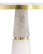 The Eleanora Drinks Table has a telescoping body composed of stacked alabaster segments that are separated by rings of brass. The disc of alabaster that forms the tabletop rests on a brass disc into which the top fits snugly, mimicking the thickness of the other rings. The base is a smaller alabaster disc that anchors the white stone table.