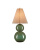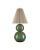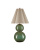 The Kindred Table Lamp is a double stacked-orb lamp made of ceramic onto which dark green glazes have been applied to create a mottling effect. Though the color achieved is deep toned, it is also quite glossy to give it tremendous sheen. Topped with a clover-shaped shade that narrows as it rises, this generously sized green lamp at thirty-four-and-a-half-inches tall will be a statement piece in a room.