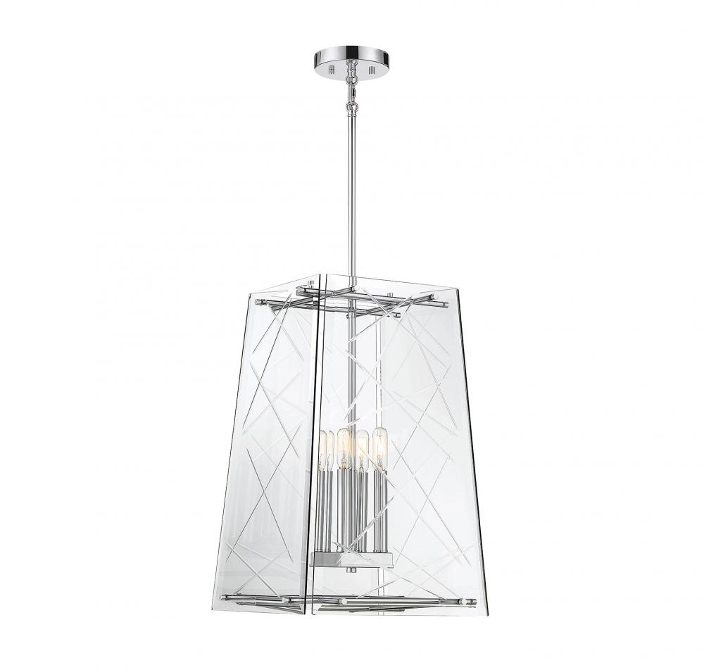 This Savoy House Kole 4-light pendant features an intriguing crisscrossing pattern that decorates panes of clear water glass, creating a look that truly sets Kole apart from other pendant lights. Because of its larger size, Kole is great for foyers and entryways, but it is also ideal for other pendant lighting applications. Finished in polished chrome. Kole is 14" in diameter and it has an adjustable height ranging from 27" to 73".