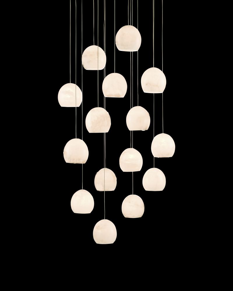 The Lazio Round 15-Light Multi-Drop Pendant has luminous shades carved from natural alabaster. The veining in the material makes each shade unique because each stone taken from the earth will have its own personality. The canopy of this piece is luminous in a painted silver finish. This fixture is among Currey & Company's multi-drop pendant collection, which includes multiple configurations.