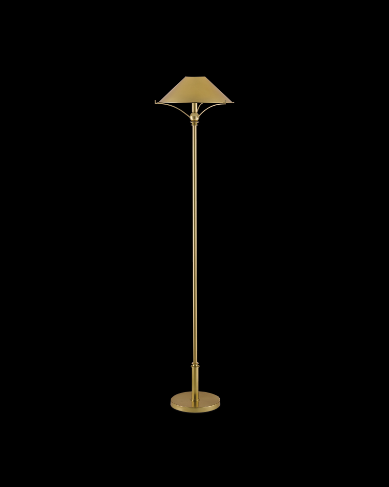 Our Maarla Brass Floor Lamp is made of metal in a polished brass finish. Design notes are the globe decorative elements at the top and bottom of the stem, the indented rings rising from the base, and the way the arms clasp the metal shade. Even the length and thinness of the stem on this brass floor lamp are graceful touches.