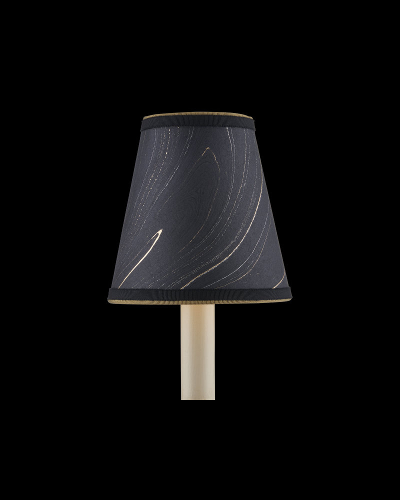 Petite shades are an easy way to bring added style to a space while also introducing color and texture, particularly when they are made from artisanal marbleized paper and ornamented with two layers of grosgrain ribbon in different hues. The saturation of the colors on the handmade tapered and cylindrical shades for chandeliers and wall sconces is achieved by a New England atelier. Patterns will vary because they are created during a very organic process that makes any surface treated to marbleizing so special. There are both vivid and pastel patterns in this collection, as you can see from this black, gold, and silver version of the tapered shade. Top Diameter: 3" Bottom Diameter: 5" Height: 5"