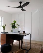 The Maverick 52 LED in Matte Black w Matte Black Blades features an 85.0 X 28.0 6-speed motor with a Thirteen-degree blade pitch. The famous Maverick ceiling fan is now available with an integrated LED light. This advanced LED technology is carefully designed and selected to have the highest quality LED chipsets for superior performance and reliability. With a sleek modern silhouette, a DC motor, and super energy efficiency, the Maverick LED ceiling fan features softly rounded blades and elegantly simple housing. Maverick LED is available in 52, 60, and 70-inch blade sweep and a 3-blade design that delivers a distinct profile and incredible airflow for living rooms, great rooms, or outdoor covered areas. It includes a hand-held remote with six speeds and reverses. All versions feature beautiful hand-carved balsa wood blades. ENERGY STAR qualified. Maverick fans are damp-rated. A
