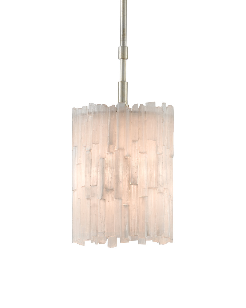 Our Moonstone Pendant in the Aviva Stanoff Collection has a shade of Selenite crystals dangling from a frame in a chinois silver leaf finish. This silver and crystal pendant quietly glows whether the lights are switched on or not. Adjustable from 16.25" to 55.25" with use of included chain/rod kit/cable. If your space calls for a longer drop, additional chain/rods/cable is available for purchase.
