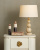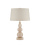 Made of natural travertine, the Niobe Table Lamp has a whimsical profile created by the graduating stacked balls that rise from a disc base of the same material. The texture of the beige lamp is enhanced by the flecks in the flax linen shade. Because this beige lamp is made of natural stone, texture and color may vary from lamp to lamp.