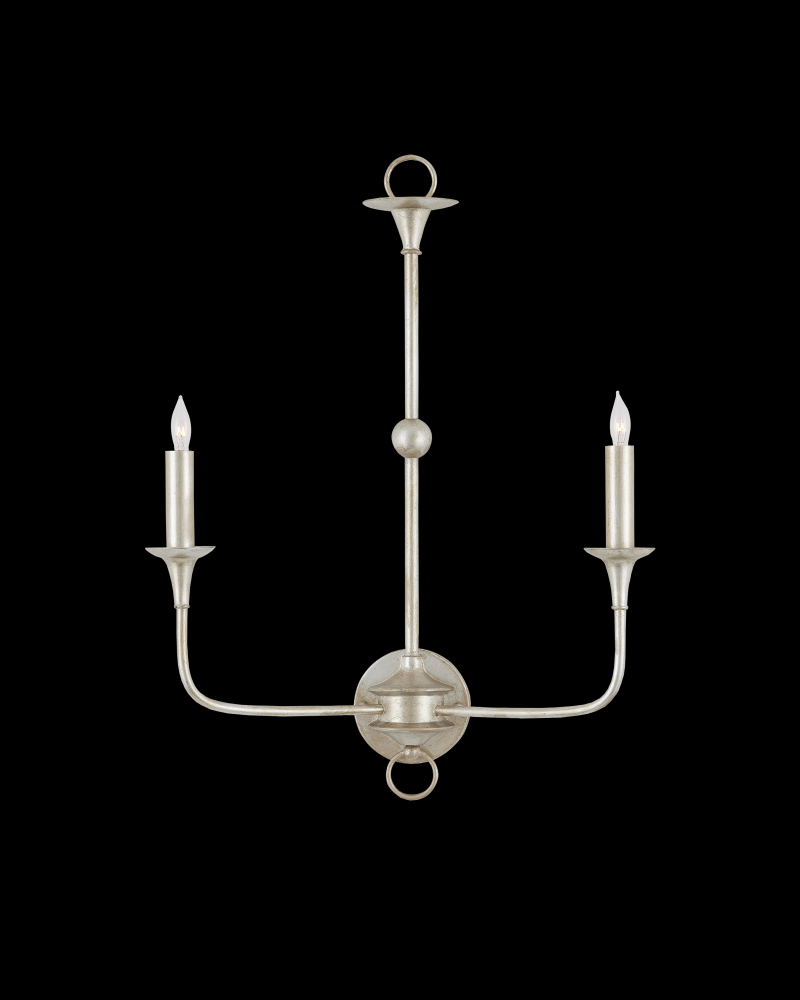 The arms of the Nottaway Champagne Large Wall Sconce stretch gracefully from a half-spool shape that rests at the bottom of its stem, ornamented with a dainty ring. Though this is a seriously minimalist fixture, the profile of the silver wall sconce has a lovely fluidity to it that also makes it a natural choice for traditional and transitional interiors. The champagne finish on the wrought iron frame adds a very subtle textural interest.