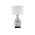 The Ostracon Table Lamp is made of ceramic with a gray and cream glazing that overlays a swirling blue pattern to give it depth. Sitting atop a black base, the blue table lamp is topped with an ivory shantung shade that echoes the creamy hues in its body.
