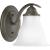 One-light bath fixture featuring soft angles, curving lines and etched glass shades that mount up or down. Gracefully exotic, the Trinity Collection offers classic sophistication for transitional interiors. Sculptural forms of metal and glass are enhanced by a classic finish. This transitional style can transform a room or your whole home with its charming versatility. Antique Bronze finish.