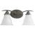 Two-light bath fixture featuring soft angles, curving lines and etched glass shades that mount up or down. Gracefully exotic, the Trinity Collection offers classic sophistication for transitional interiors. Sculptural forms of metal and glass are enhanced by a classic finish. This transitional style can transform a room or your whole home with its charming versatility. Antique Bronze finish.