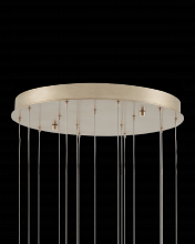 The Parish 15-Light Round Multi-Drop Pendant has slender tear-drop-shaped shades made of white glass poured into a metal cage in an antique brass finish when it was still molten. A remarkable result of this process is that it creates tiny pinholes of light that escape through micro-bubbles that formed in the glass, making the Parish effervesce like an upside-down goblet of champagne.