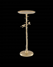 The Piaf Gold Drinks Table is a cast aluminum accent table in a luminous gold finish that will make it gleam from its spot in a room. The whimsical design has two birds perched on twigs extending from a branch-like stem that holds its top.