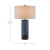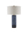 The Polka Dot Blue Table Lamp has a columnar ceramic body with a flowing pattern of circular shapes pressed into it, creating drifts of polka dots. Covered in a reactive glaze, the navy blue table lamp has added depth and texture when a brighter blue color shows through. A metal finial holds the natural linen shade in place.