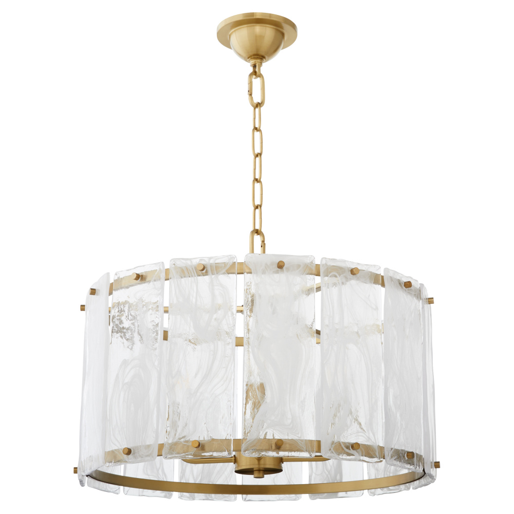 Make a statement with the Prestige series through its clear alabaster glass panels that resemble chiseled ice. Angular matte black or aged brass frames support rectangular glass panels fastened by screw details. The glacier-like diffuser conceals candelabra sockets, creating a spectacle of radiance.
