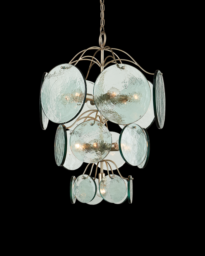 The Rovigo Chandelier has a flowing design created by the wrought iron frame to which discs of recycled glass are attached. The silver leaf finish and the textural mottled glass gleam when the lights are switched on. The silver chandelier has a contemporary feel thanks to the uniform shapes and clean edges of the discs that graduate from larger to smaller as they flow toward the bottom of the fixture. Adjustable from 36.5" to 104.5" with use of included chain/rod kit/cable. If your space calls for a longer drop, additional chain/rods/cable is available for purchase.