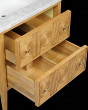 The Santos 28" Sea Sand Vanity has a split rattan pattern on the drawers and sides made by hand and applied to a solid mahogany frame. Then a Sea Sand finish covers the entire piece. Two sets of pulls are included in brass and polished nickel finishes to allow some customization. The vanity has two working drawers, the bottom of which has a removable organizational divider. The white Carrara marble top is fitted with a white rectangular undermount sink. Other fine design attributes include soft-close drawers and a removable matching marble backsplash.