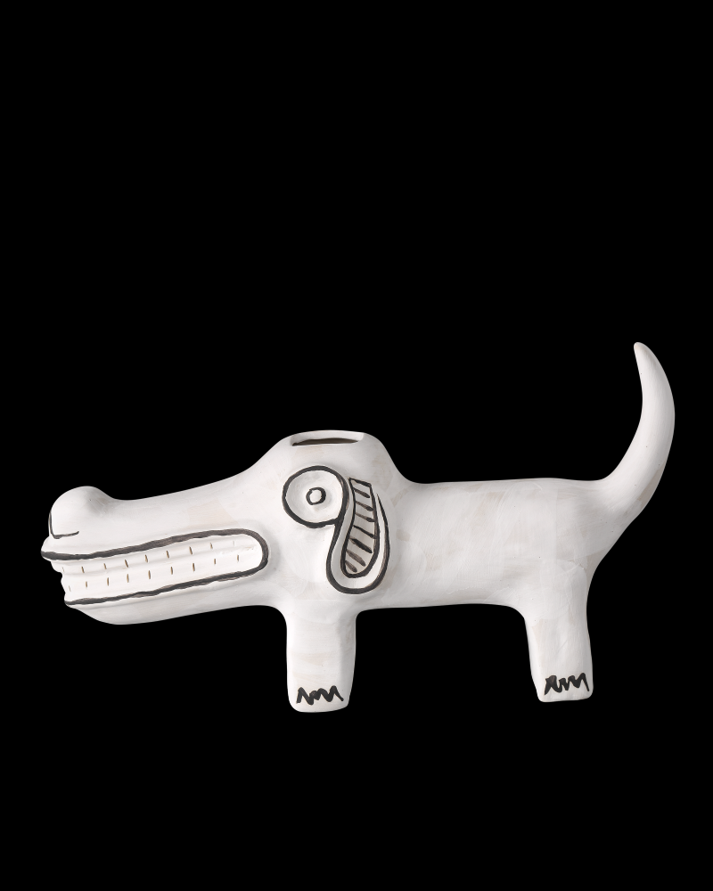 Artist Xiang Yang, a brilliant ceramist, took a walk on the wild side when he created Spot the Dog. Made of porcelain in a washed-white finish with black whimsical details painted by the artist, the haunting vessel will create a stir not unlike Picasso's work did during his ceramics period as he experimented in the South of France.