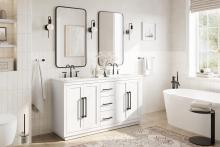 - This transitional bathroom vanity comes in five elegant finishes to suit a variety of styles: Crisp White for a clean, timeless look, Sleek Grey for modern sophistication, Chocolate Oak (dark brown) for a rich.