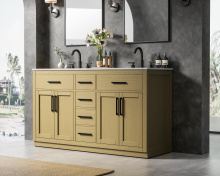 Introduce a perfect balance of functionality and style to your bathroom with this thoughtfully designed vanity. Constructed with a combination of solid wood and MDF, it offers durability and a sturdy build. The sleek engineered marble countertop with subtle grey marbling complements the rustic wood grain finish, creating a stylish and inviting centerpiece for your bathroom. Designed in a contemporary style with a transitional flair, it features a U-shaped shelf for seamless plumbing integration and multiple soft-close drawers for clutter-free organization. A pull-down drawer enhances convenience, while the toe kick adds a refined, clean-lined appearance and simplifies cleaning underneath. Matte black hardware contrasts beautifully with the cabinet finish, tying the look together. Delivered fully assembled and equipped with foot levelers, this vanity combines practicality and aesthetic appeal to suit modern and transitional bathrooms alike.