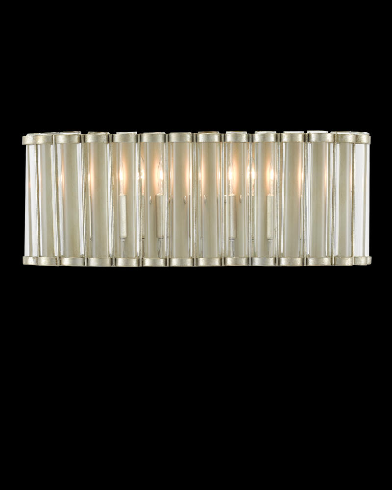 Bunny Williams has achieved a timeless profile with the Warwick Wall Sconce that diffuses light through high-grade optic crystal tubes. Ribbons of wrought iron in a contemporary silver leaf finish hold the canisters of illumination in place so that the curved form is barely discernable from the front. This silver wall sconce is certified for damp locations.