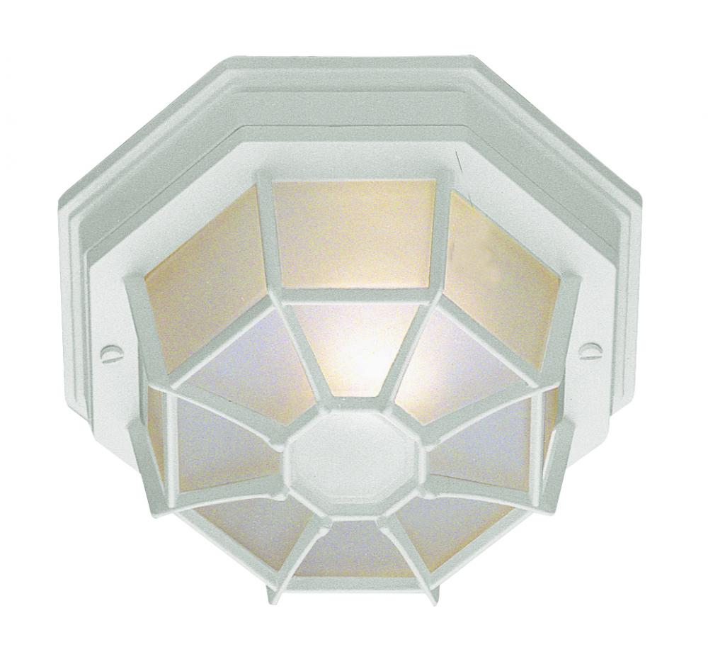 The Benkert Collection is a low-profile style designed to cast a soft ambient light over a wide area. The distinct shape blends with any decor , while also illuminating a variety of outdoor living areas. The prominent web-like metal housing is an octagonal shape. The Benkert 5" Flushmount Lantern accepts a single light, has frosted glass panels and is offered in multiple finish choices.