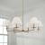 The decadence is in the details. The Gilda Large Chandelier brings the glamour with interchangeable tortoise shell or clear acrylic bobeches. The Aged Brass finish adds a warm tone, while the tapered White fabric stay-straight shades and squared arms create a crisp, classic aesthetic.