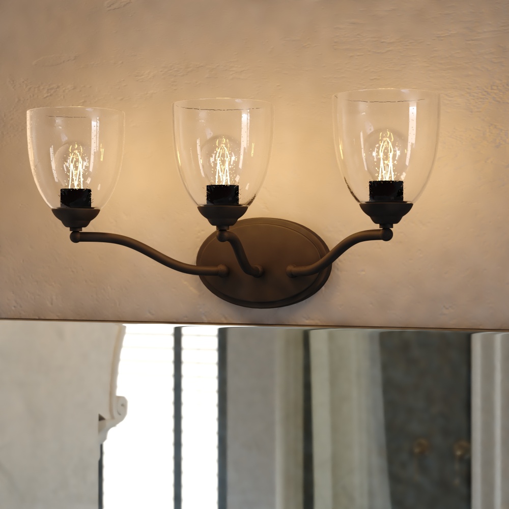 Transform your bathroom's ambiance with the Bellwood 3-light vanity, a perfect blend of classic design and modern sophistication. The matte black finish provides a timeless feel, while the clear seeded glass shades add a touch of vintage charm, diffusing a warm, inviting light. This wall light reimagines traditional style with thoughtfully updated details, including classic sphere accents and graceful tulip glass shades. Damp-rated for lasting performance, the Bellwood vanity is designed to withstand the moisture of bathroom environments. Enhance your daily routine with a fixture that seamlessly bridges traditional charm and modern functionality.