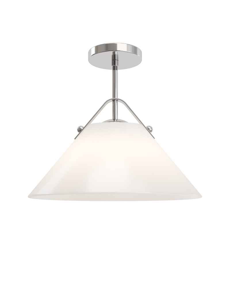 The Bronwen Nickel Pendant is an equestrian-inspired design with a flaring white glass shade fastened to the round canopy with a sophisticated strap—a subtle nod to classic tack hardware. The profile can lean modern farmhouse, though it also complements other design styles. The metal in a polished nickel finish is complements the paleness of the shade, which has a glossy surface that glows. At 19 inches in diameter, the one-light pendant is dimmable. Adjustable from 18" to 60" with use of included chain/rod kit/cable. If your space calls for a longer drop, additional chain/rods/cable is available for purchase.