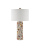 As its name implies, the tall columnar body of the Festoon Table Lamp is adorned with assorted seashells in an array of colors and shapes that have been sprinkled artfully along its surface. The hardware in a sugar white finish matches the palest ark and auger shells, and the ivory drum shade draws out the beige speckles in the tiny scallop shells. A fun detail on this lamp is the shell-encrusted finial.