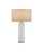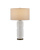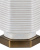The Glebe Table Lamp has a hexagonal shape made of ceramic with a white glaze withvery subtle hints of beige and blue. The geometric complexity of this white lamp is heightened by the striated lines pressed into it and the indentions at the base, near its center, and as the body meets the hardware at the top. The base, hardware, and finial in an antique brass finish are warm elements to the design, as is the textural shade.