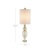 The Hutson Table Lamp is a Milano-inspired design made of composite finished with a pearlescent powders to bring added sheen to the surface of the three round shapes that graduate in color from lighter to darker as the geometric forms rise toward the shade. Sitting atop a disc-shaped base and topped with a very tall shade, the lamp is a great choice for console tables or buffets, as it is 37 inches tall but is only a foot in diameter.