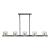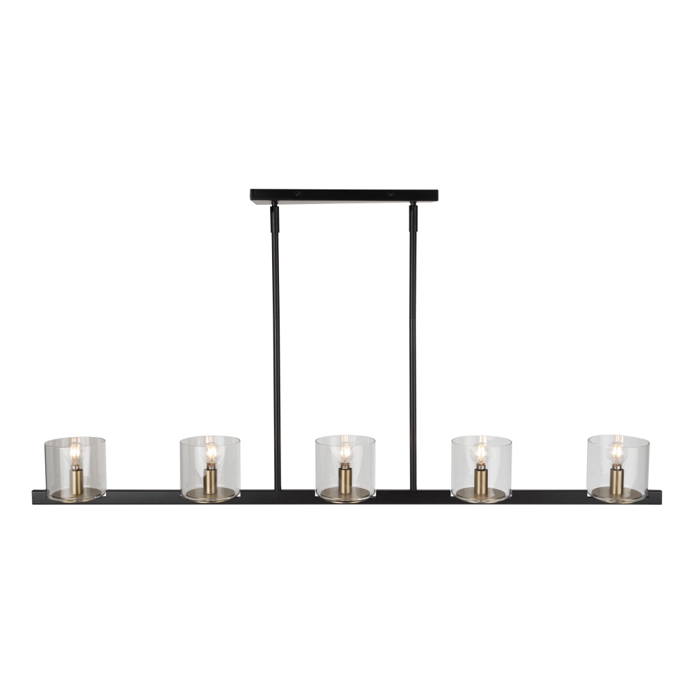 The Salinas Collection by designer Kevin Kraemer, has black frames complimented with brushed brass candles covered by clear cylinderical glassware. Linear island chandelier model shown