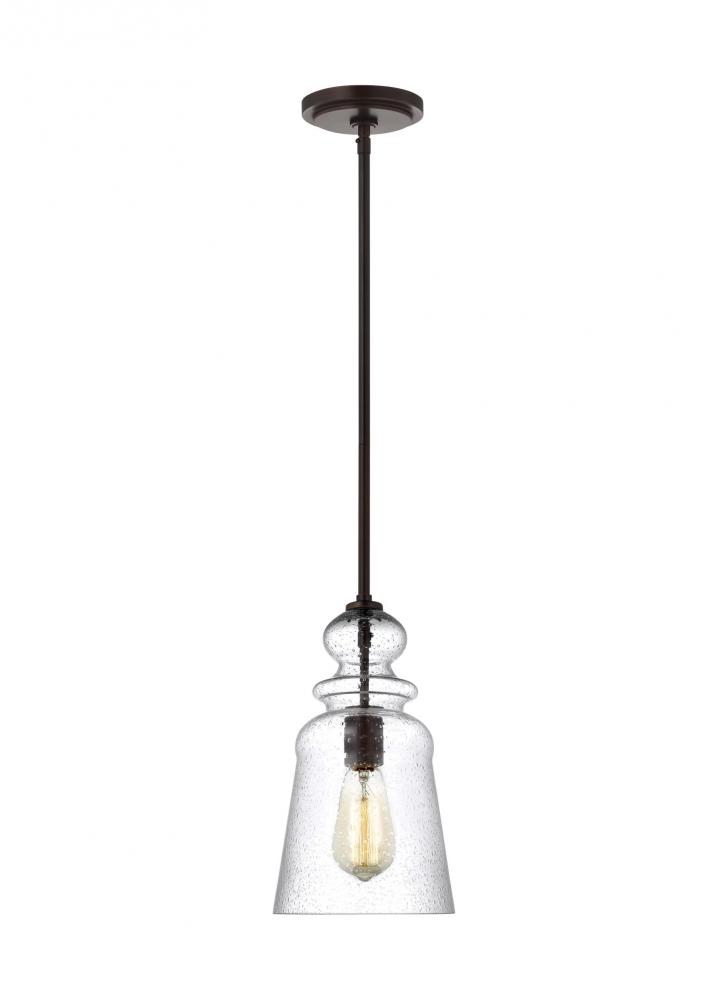 The Kea one light indoor pendant in bronze is the perfect way to achieve your desired fashion or functional needs in your home. Inspired by the stacked modern elements of items found in Parisian boutiques, the silhouette of the Kea Collection by offer a signature focal point with a single lamp suspends downward from the center. A hint of Brushed Nickel or Heirloom Bronze peeks through the Clear Seeded glass becoming a central design element of the fixture. Kea pendants may be installed as single pendants or clustered in multiples, which would be an ideal installation used for entry lighting, dining room lighting, living room lighting or kitchen lighting over a table. Fixtures are California Title 24 compliant and easily convert to LED by purchasing LED lamps sold separately.