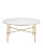 The Kira Marble Cocktail Table is a classically designed gold and white coffee table with modern lines thanks to the tapering of the legs at top and bottom and the clean-lined stretchers. Made of iron in an antique brass finish, the gold cocktail table is topped with a disc of white marble that ups the ante on its sophistication. Introducing an enhanced sense of refinement are the circlet details where the stretchers clasp each of the four legs.