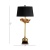 The Metamorphosis Table Lamp has a soft antique brass finish on its tall vase-like brass body encircled by a fluttering leaf. Classical in its lines, the lamp is topped with a black shantung shade that has a gold lining. The black granite base anchors the imaginative profile of this brass lamp.