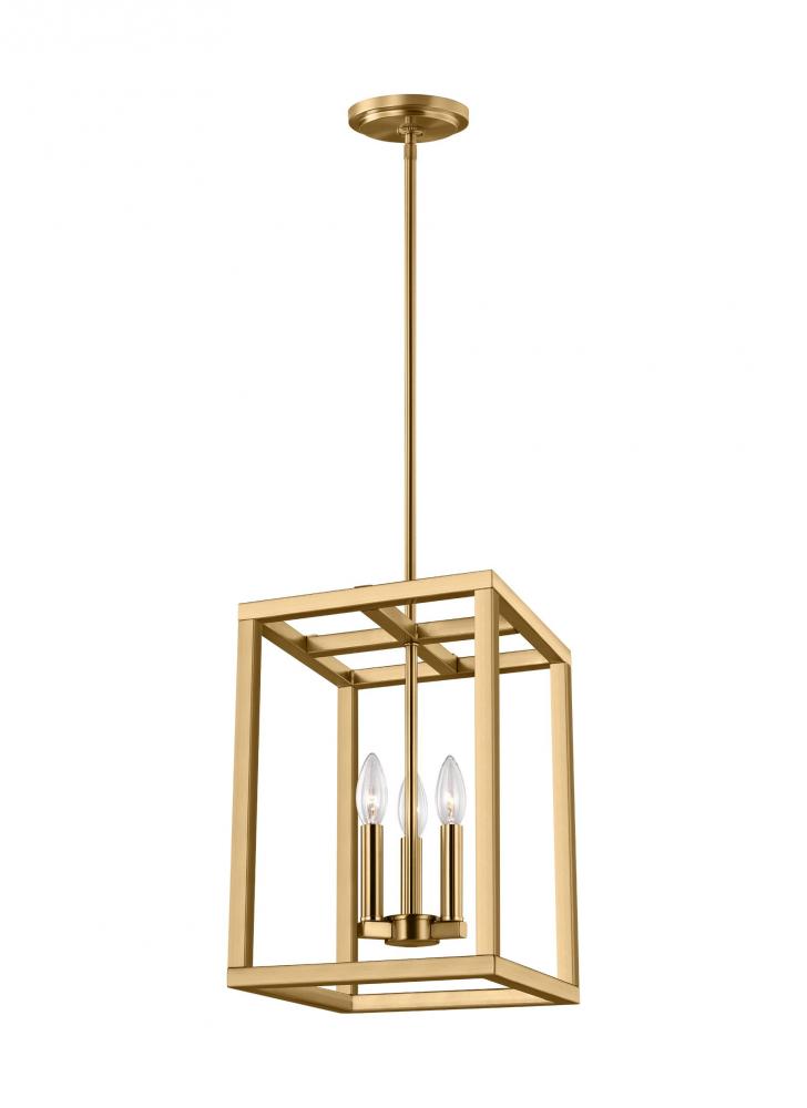 The Moffet Street three light indoor pendant in satin brass provides abundant light to your home, while adding style and interest. The Moffet Street series offers a distinctive take on a rustic theme. Built in broad steel frames with hand-applied finish that mimics natural wood. This combination of rustic and urban fits comfortably in a wide variety of environments. The sharp, squared lines of the frame complement a wide variety of settings. The collection includes eight-light foyer, four-light foyer, one- light wall sconce, and a six-light island fixture. The Moffet Street series is available in three beautiful finishes Washed Pine, Brushed Nickel and Satin Bronze All fixtures are California Title 24 compliant and damp rated for use in sheltered, damp environments.