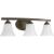Adorn features a sweeping arced frame that supports elegant, tapered glass shades. This three-light bath fixture is finished in Antique Bronze with etched glass. It can be installed with shades facing either up or downwards. Adorn coordinates great with the Joy and Bravo families.