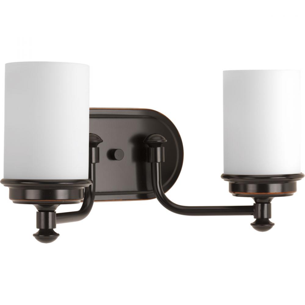 Ideal for a bathroom and powder room.;Perfect for coastal, farmhouse, and transitional style settings;Handsome rubbed bronze finish;Elegant etched opal glass shades;Mount the light fixture facing up or down;Use 2 medium base bulbs that are sold separately