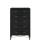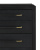 The Verona Black Five-Drawer Chest is darkly handsome covered in black lacquered linen with metal detailing in a champagne finish. The stretchers on this black chest create added interest to enhance its flair. The beautifully detailed drawer pulls, which are wrapped in matching material in the middle and left bare on each end, grace each drawer with their metallic sheen. This is a sophisticated touch, as are the squared edges of the hardware that match the straight-edges on the stretchers.