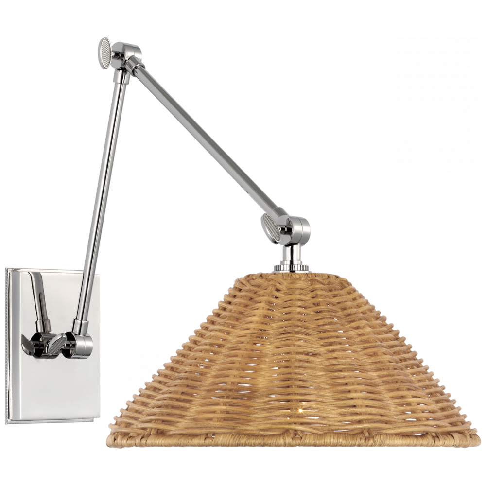 Marie Flanigan's Wimberly combines organic materials with refined metals. The linear, wrapped floor lamp is topped with a wicker shade, while the articulating wall light, available with single or double arms, comes in polished nickel with a natural wicker shade or soft brass with a white shade. Ideal for setting the right mood and providing ideal lighting in living rooms or studies.